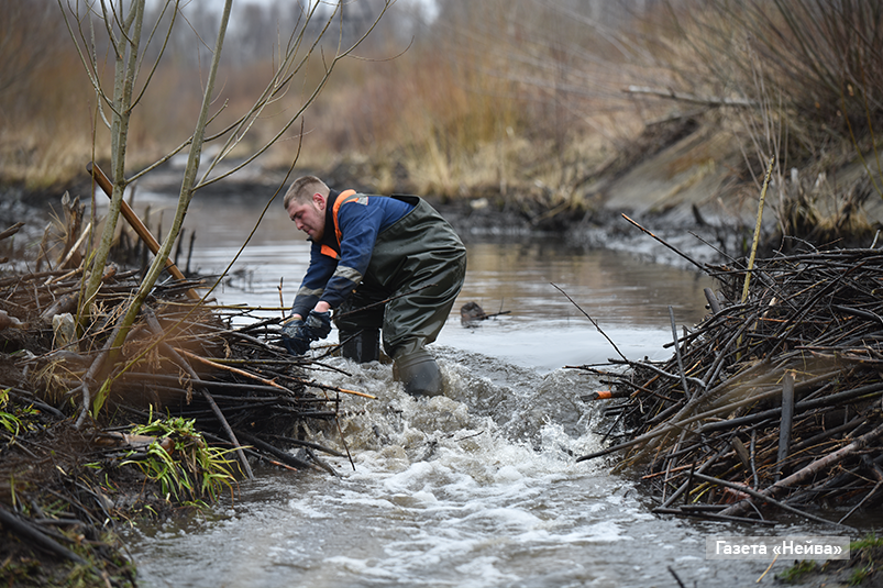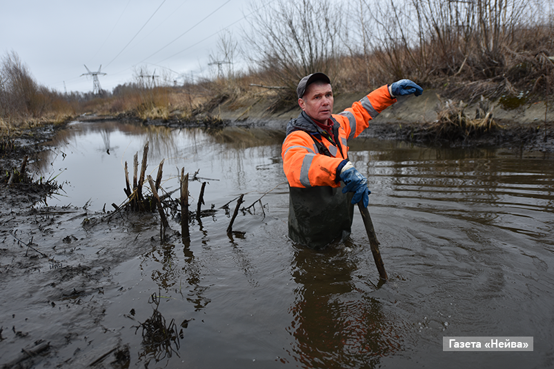 «Каждый год бобры строят на этой реке плотины. Особенно дальше по течению, где идет железная дорога и кабели, — начинает рассказ Денис. — А из-за плотин уровень воды поднимается, и вода уходит на железную дорогу. И чтобы этого не происходило, мы потихоньку эти плотины рушим».