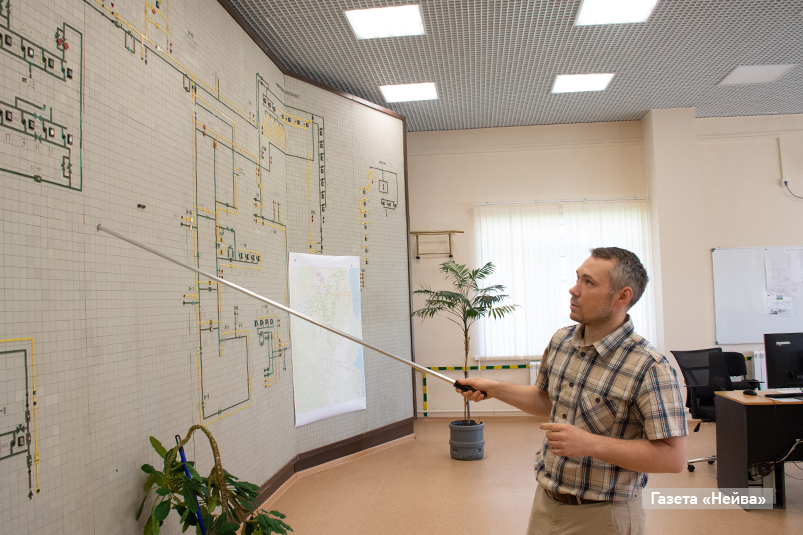 Александр подробно рассказывает мне про каждую сеть, показывая её на схеме, обозначает проблемные ситуации, которые возникают при ремонте труб, что сказывается на качестве воды у жителей города. Но это уже не зона ответственности предприятия.