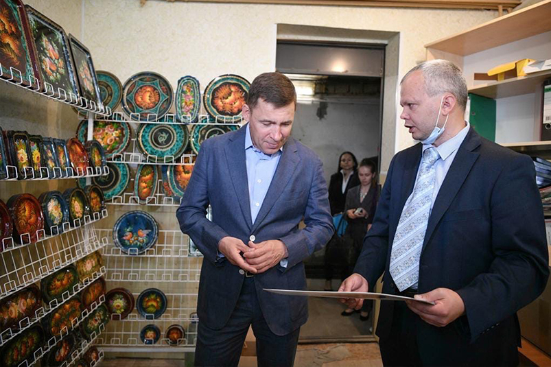 Андрей Васильев провёл экскурсию для губернатора по своему производству, познакомил с художницами, расписывающими уникальные уральские подносы. Мастерицы здесь расписывают не только сами подносы, но и, к примеру, таволжскую керамику – ещё один уральский бренд. Однако помещения, в которых они работают, оставляют желать лучшего. Губернатор поручил сегодня Мининвесту и руководству города найти для производства более подходящую площадку и оказать другую поддержку. А также изучить возможность создания музея современного подноса.