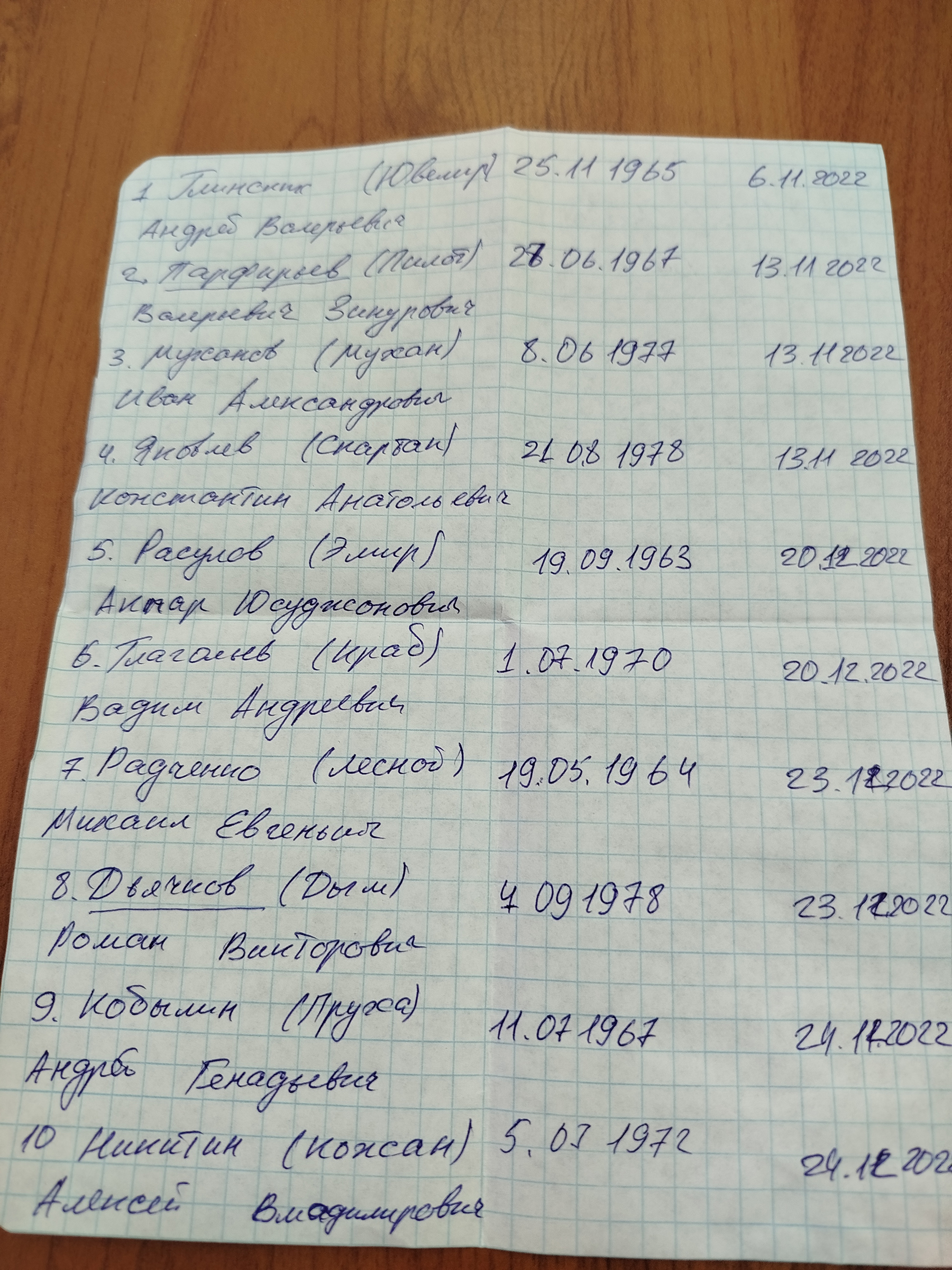...Из кармана спецовки он достает свернутый тетрадный лист. В нем от руки написаны имена ребят «уральской роты», тех самых добровольцев, кто в октябре 2022 года по собственному решению отправился в зону СВО. Напротив каждого имени — две даты: дата рождения и дата гибели. Среди погибших — 11 его земляков-однополчан отряда «Барс-15», большинство приняли свой последний бой под Макеевкой Луганской народной республики в 20-х числах декабря. Сам Сергей с позывным «Сера» был тяжело ранен и выбыл из строя 24 декабря…