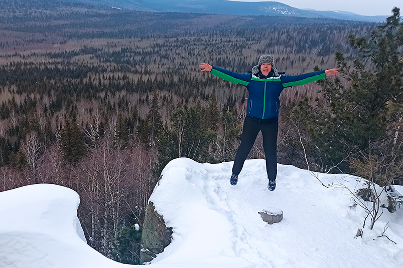 И вот она — главная остановка: на полянке у подножия Журавлихинских скал. Разожгли костёр. Накрыли стол. Пока вода в котелках закипала, забрались на вершину, чтобы посмотреть на виды. С Журавлихи можно увидеть горы Малиновую, Сутук, Долгую и другие. Виды — замечательные! Не зря мы сюда так долго шли!