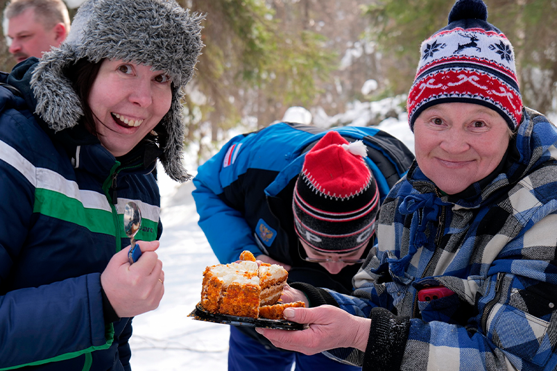 Сделав несколько снимков, мы устроили трапезу у костра. Поесть в походе — самое любимое дело! На общем столе были только что сваренные пельмени и чай, бутерброды разных видов и даже торт.