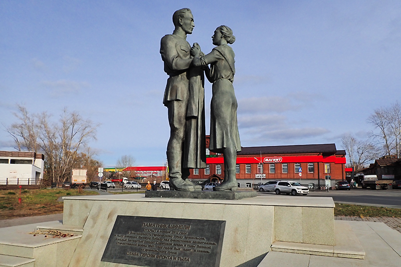 Отведав выпечки из лавки при храме, двигаемся на юго-запад по улице Октябрьской до пересечения с улицей Ленина, в сторону бывшей Арамильской суконной фабрики. Напротив неё находится набережная пруда. В солнечную погоду здесь можно насладиться красивыми видами. А ещё на набережной есть памятник шинели. Как написано на сайте геокешинга, это единственный в мире памятник данному предмету одежды. Дело в том, что фабрика была самой большой на Урале и в Сибири и каждый четвертый солдат во время Великой Отечественной войны был одет в шинель производства фабрики.
