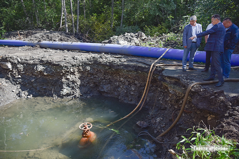 Капремонт 1700-метрового участка магистральной сети от цеха водозабора «Водоканала» до насосной станции второго подъёма (на фото) фактически сделан. На этой неделе должны пройти переключения. То есть этот сложный ремонт, проходивший в болотистой местности, завершён.
