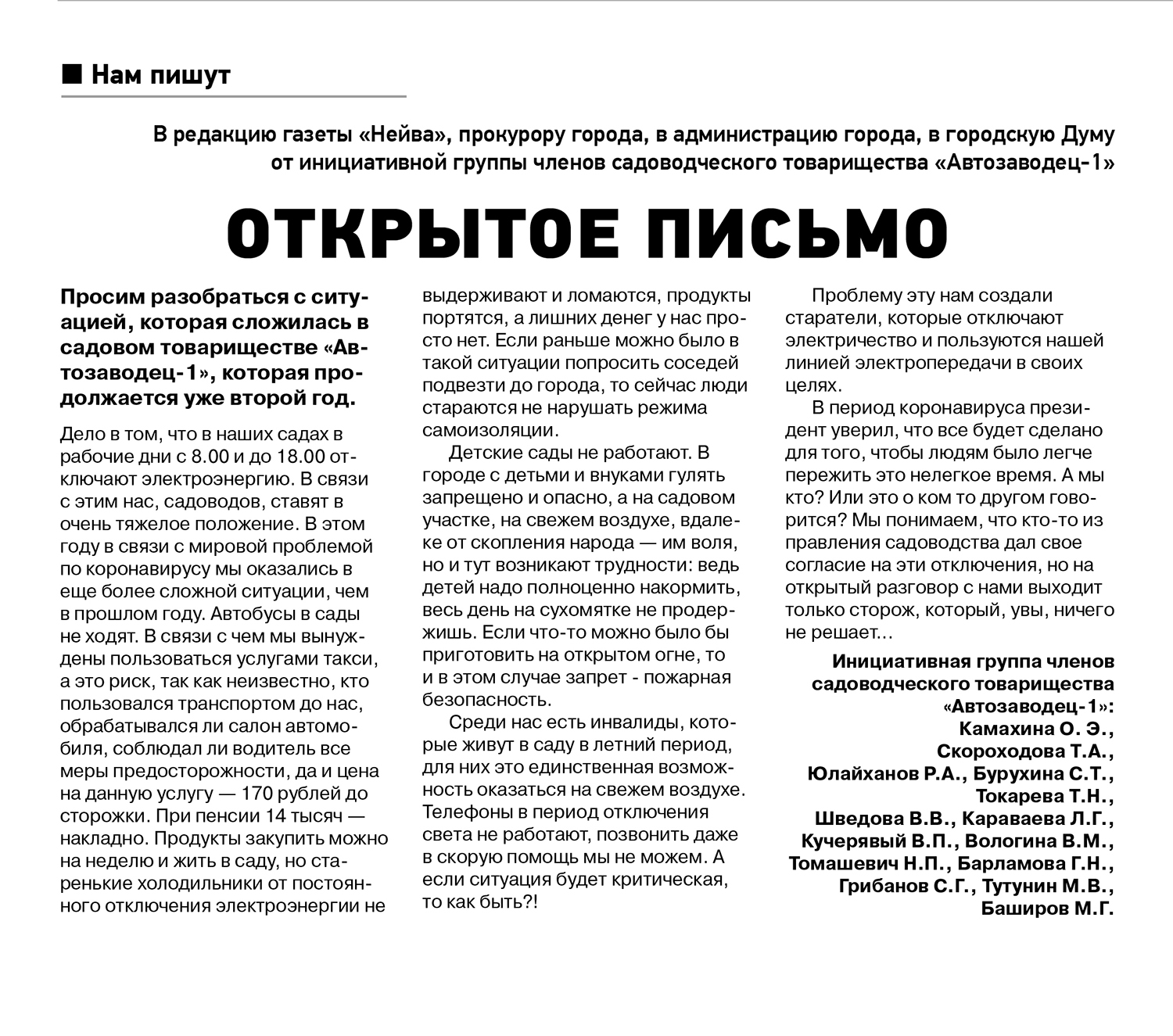 Напомним, в печатной версии «Нейвы» № 36 (2875) от 13.05.20 было опубликовано письмо садоводов, в котором они обращались в редакцию, в прокуратуру, в администрацию и Думу НГО с просьбой разобраться с отключениями электроэнергии в садах «Автозаводец-1».