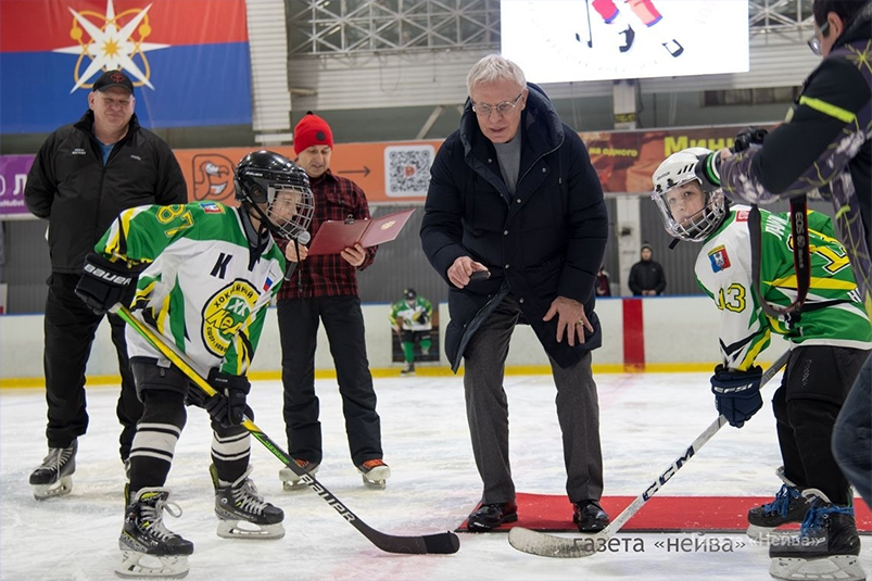 Вместе с главой НГО Вячеславом Тюменцевым поприветствовал собравшихся в КСК хоккеистов и болельщиков. Сделал вбрасывание и открыл матч кубка «Золотая шайба» между командами «Кедр-2015» и «Кедр-2016».