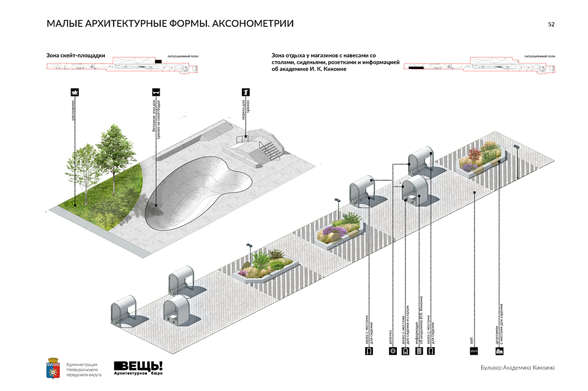 Скейт-площадка запланирована в пределах 460 кв. м. С чашей из торкретированного бетона и фигурами типа грайндбокс, рейл, радиус и т. д.