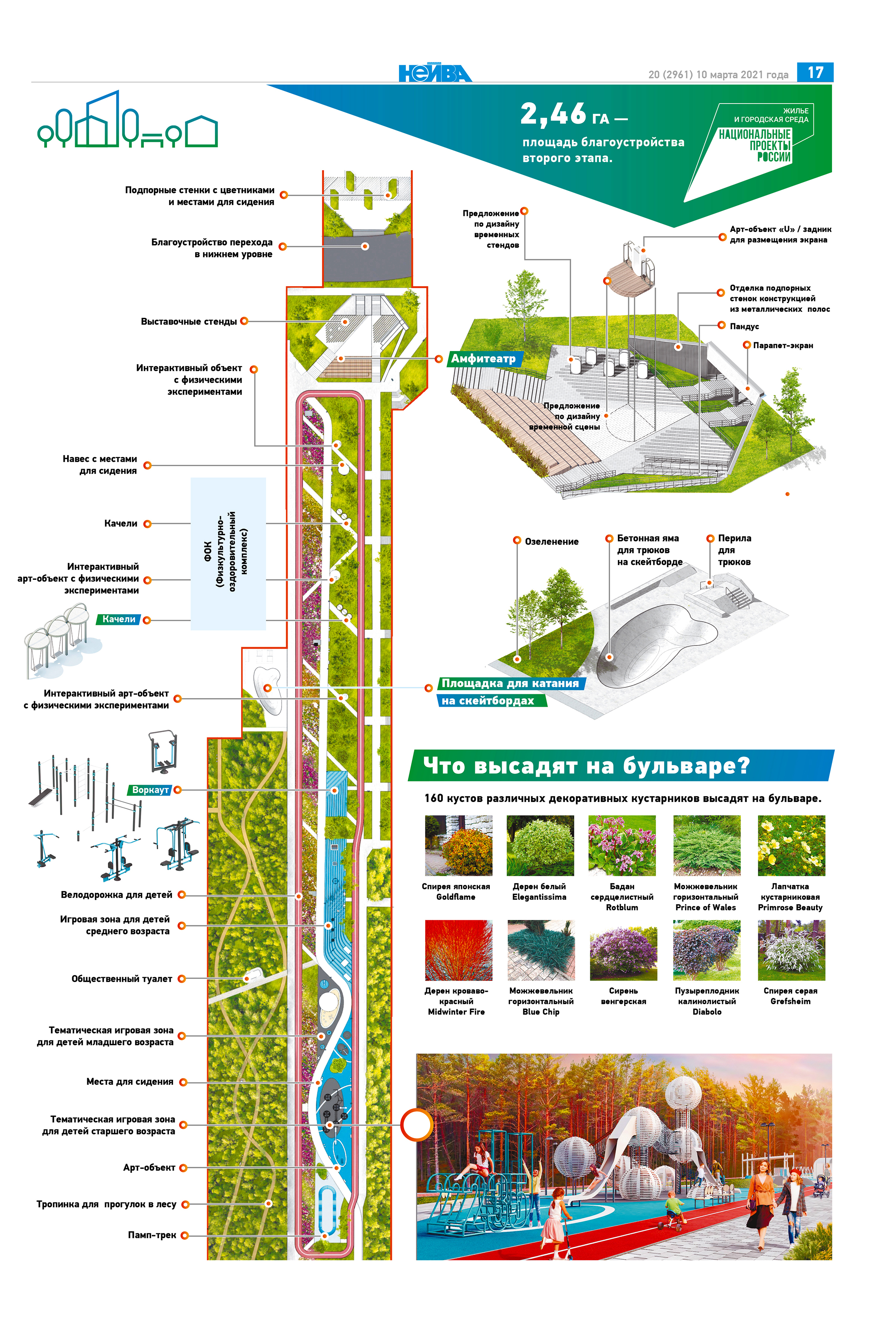 На верхней части бульвара строителям предстоит выполнить несколько арт-объектов, амфитеатр в районе поземного перехода, игровые зоны и площадки для детей разного возраста, воркаут-площадки, велодорожки, памп-трек, качели, цветники, беседки, общественный туалет и так далее.