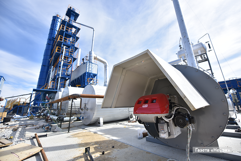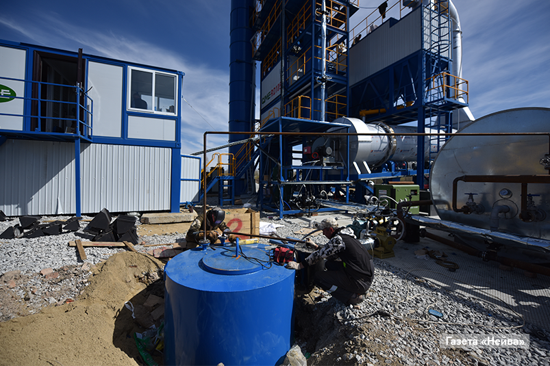 На момент визита установка по производству асфальтовых смесей была почти полностью собрана. Шла подготовка к работам и монтаж пункта весового контроля. Фактически самое главное, что оставалось сделать для запуска пусконаладки, — смонтировать линии электропередачи внутри площадки.