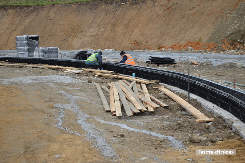 Монтируется дренажная система: рабочие выставляют лотки (готовность 50%). Здесь будет еще и подземный водосток, но пока поставщики тормозят с завозом труб. Как только все случится, можно будет устанавливать колодцы.