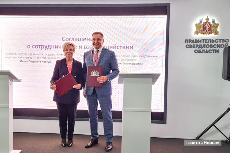 В рамках международной выставки «ИННОПРОМ-2021» состоялось подписание соглашения о сотрудничестве между ООО «НПО «Центротех» и Уральским государственным медицинским университетом. Соглашение подписали генеральный директор НПО «Центротех» Илья Кавелашвили и ректор университета Ольга Ковтун.