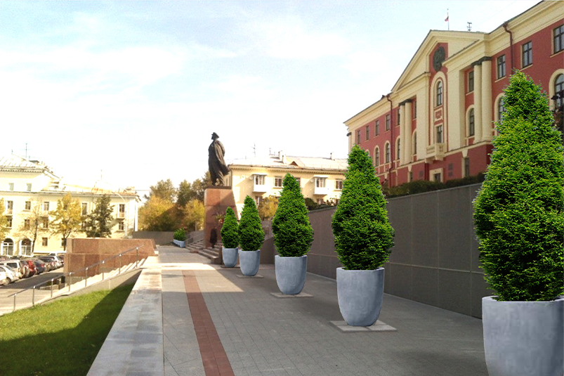 Обновление территории сквера у Театра музыки, драмы и комедии подразумевает небольшую реконструкцию технической части фонтана, устройство площадки для проведения мероприятий и декоративной колоннады, замену асфальта на тротуарную плитку и установку жанровых скульптур.