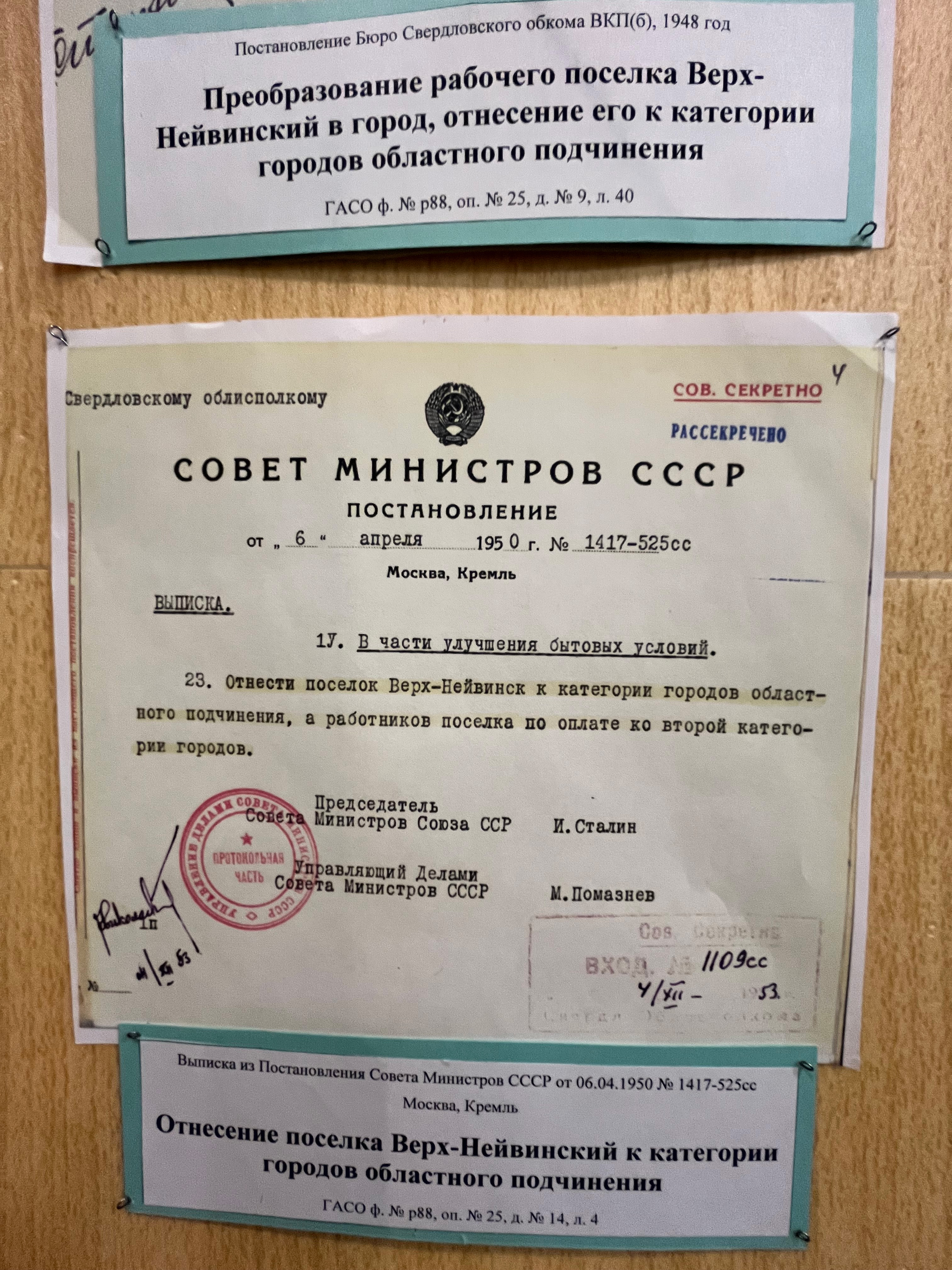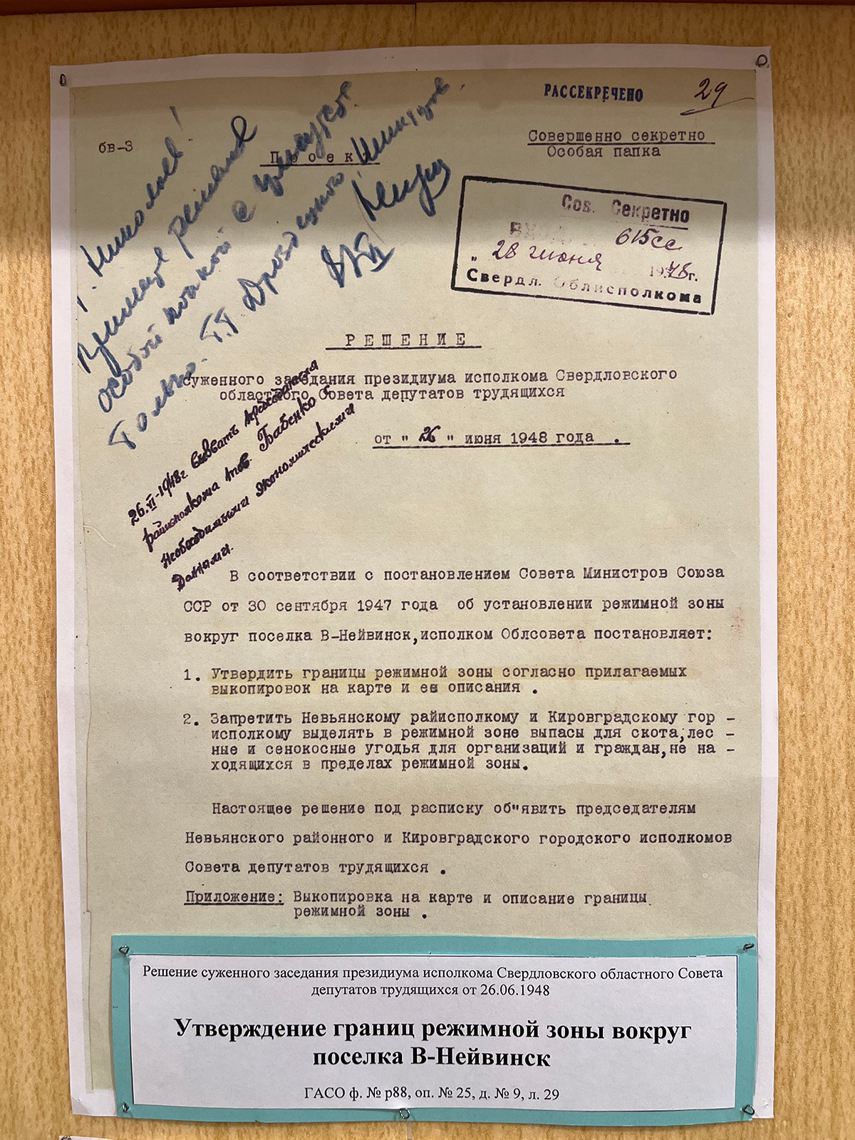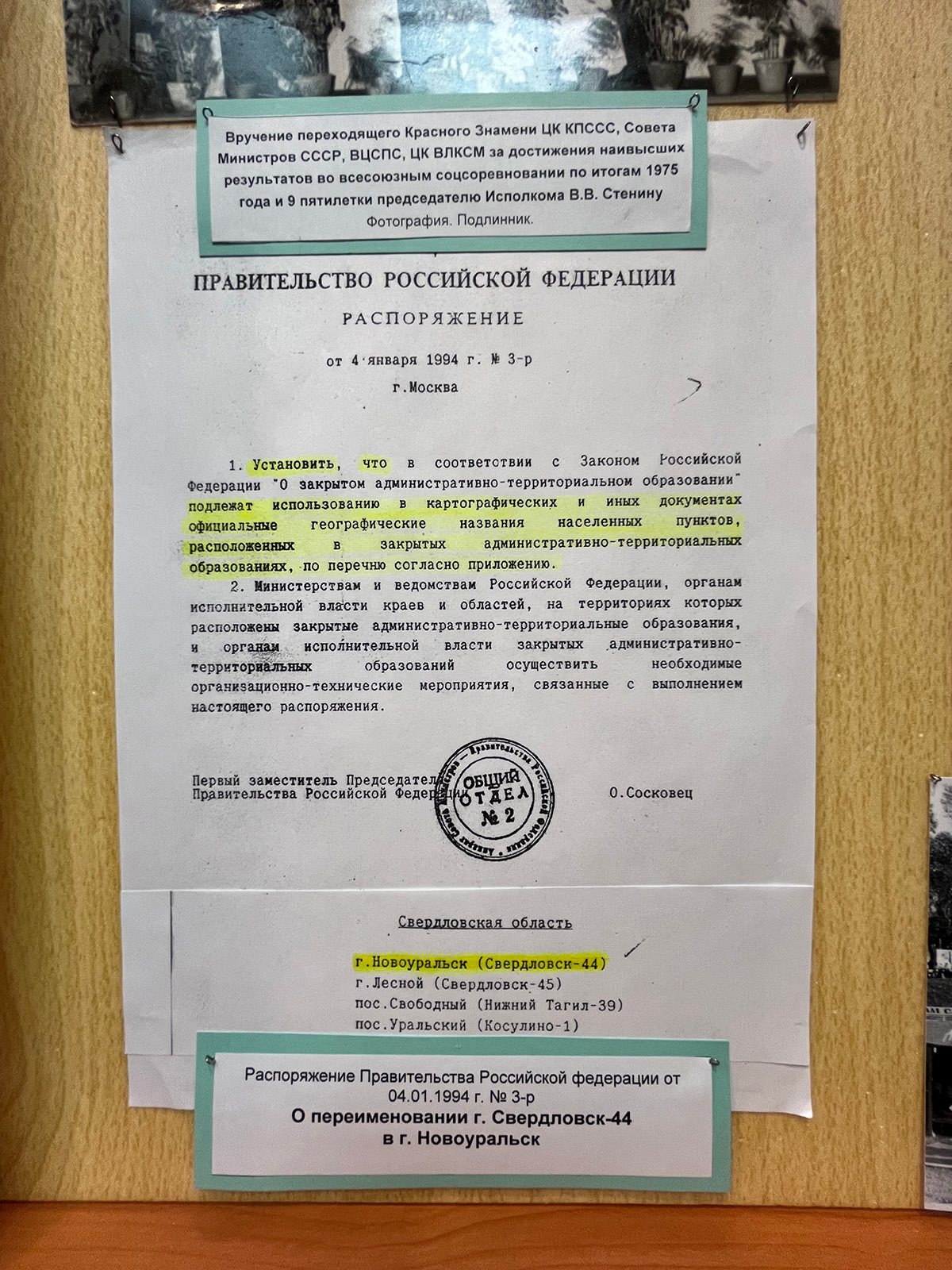 На соседнем стенде — бумаги, которые ранее не были представлены: «О расширении границ запретной зоны г. Ново-Уральска» от 12.08.1961, «О выселении из закрытых городов уволившихся с предприятий системы Министерства среднего машиностроения СССР» от 22.10.1969, «О перепрописке паспортов проживающих в городе Свердловск-44» от 23.05.1956» и еще десятки бумаг, которые будут любопытны не только специалистам архивов, историкам, но и обычным горожанам.