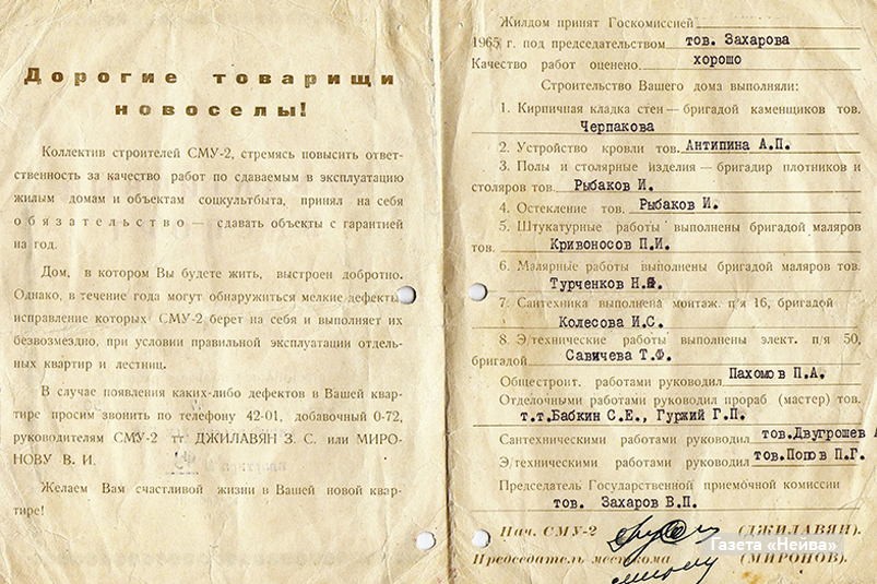 В документе отражена оценка качества работ и состав строительной бригады. То есть в далеком 1965 году строители несли персональную ответственность за качество проделанной работы, каждый на своем участке. А жители могли позвонить лично руководителям СМУ-2 и в случае чего пожаловаться на недостатки. Вот бы и сегодня возобновить подобную практику!