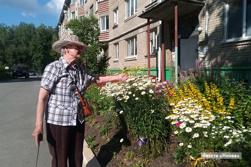 Жительница дома № 109 по ул. Ленина Зоя Левина в создании цветников у своего подъезда нашла отдушину после ухода любимого супруга. Призналась, что цветы ей годы жизни продлевают.