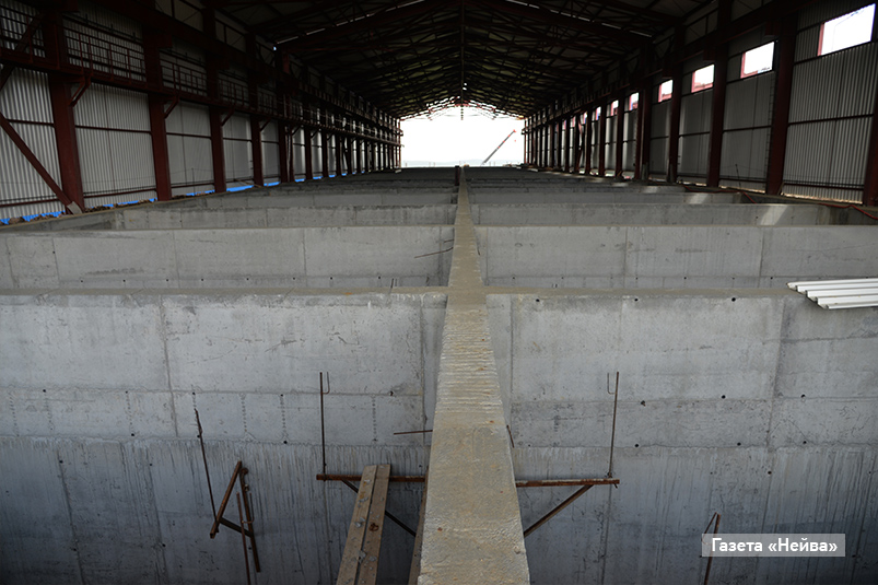 Высоко над землей возвышаются три ангара, два из них — по 120 метров в длину и 24 метра в ширину. Внутри, на 10-метровой глубине, находятся сами хранилища. «Это карты №№ 11 и 12, — комментирует ход строительства начальник участка Андрей Афанасьев. — На ангаре карты № 11 завершается монтаж металлоконструкций — работа сложная, кропотливая и очень ответственная.