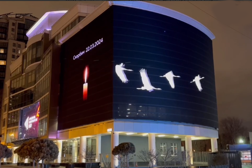 Бесконечный клин белых птиц, летящих в небо, транслируется с большинства крупных медиаэкранов областной столицы. Также на станциях екатеринбургского метро зазвучала песня «Журавли» — баллады про солдат, которые после смерти становятся птицами. Композицию исполнил народный артист СССР Муслим Магомаев, в честь которого назван концертный зал «Крокус Сити Холла», где произошла трагедия.