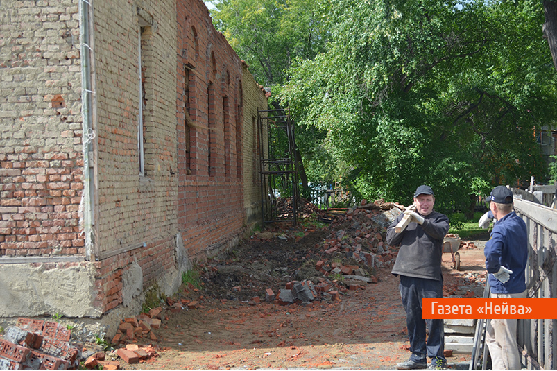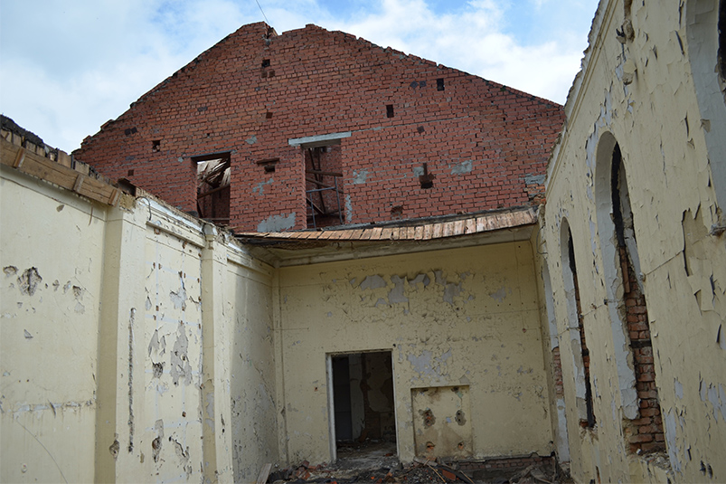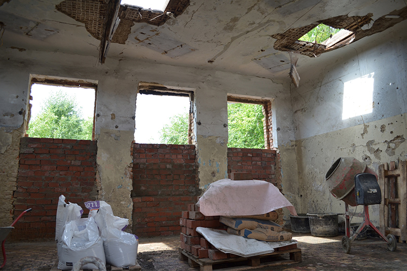 Сегодня на объекте трудится бригада из десяти человек. Продолжается демонтаж крыши, заделка кирпичом окон, подготовка к замене сетей. В сентябре планируется отштукатурить фасад здания, а к наступлению зимы у здания появится новая крыша.
