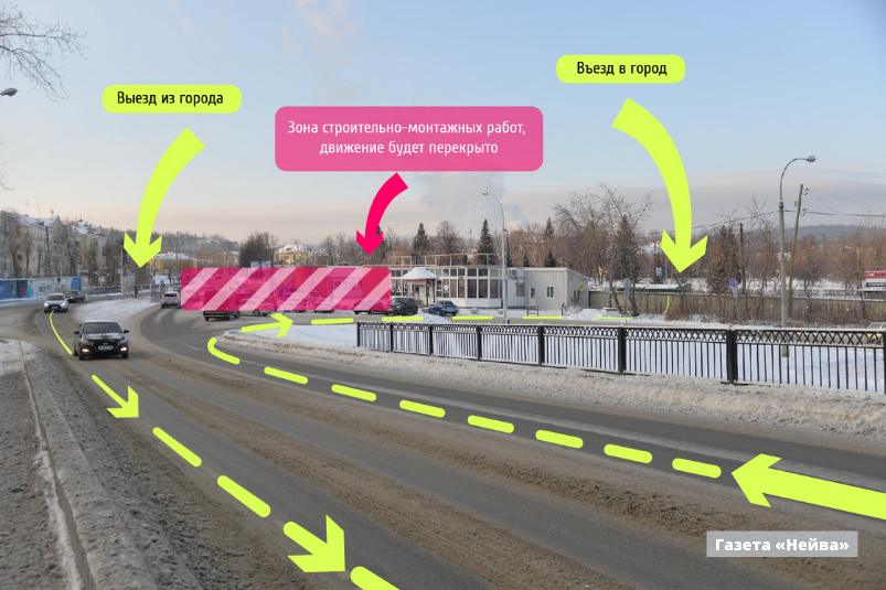 Чуть позже – не ранее конца апреля – возьмутся за проезжую часть, и это будет вторым этапом. Привычный въезд в город перекроют и откроют в ста метрах правее моста. Для этого часть забора возле стоящего там кафе снесут и сделают три пропускных шлюза. Выезд из города оставят только один (см. Схему).