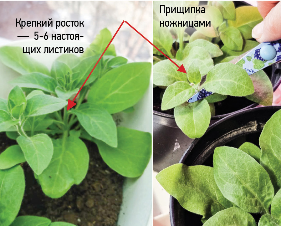 Прищипка — это удаление верхушки центрального стебля (так называемой точки роста), которое стимулирует активное ветвление растений благодаря пробуждению спящих почек и росту боковых побегов. Выполняем эту процедуру, когда у рассады появляется 5-6 настоящих листочков. Верхушку побега обрезаем острыми ножницами над 4-5-м листом (на нижнем снимке) либо аккуратно отщипываем пальцами. Повторяем после того, как отросшие боковые побеги достигнут 10-15 см.
