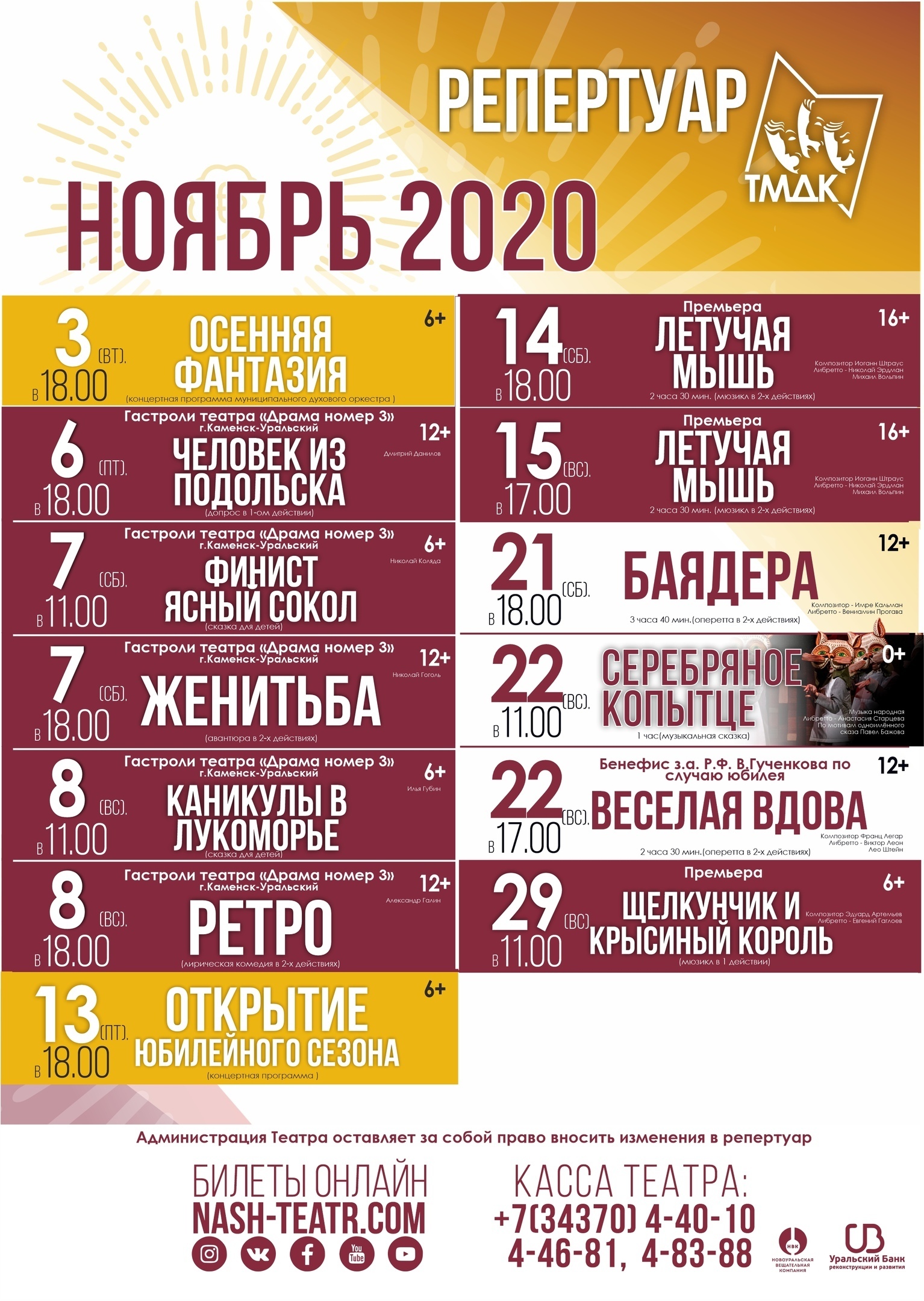 В эти же дни постановки ТМДК — драма «Детектор лжи», музыкальная комедия «Ханума» и мюзикл «Ночь перед Рождеством» — будут показаны жителям Каменска-Уральского.