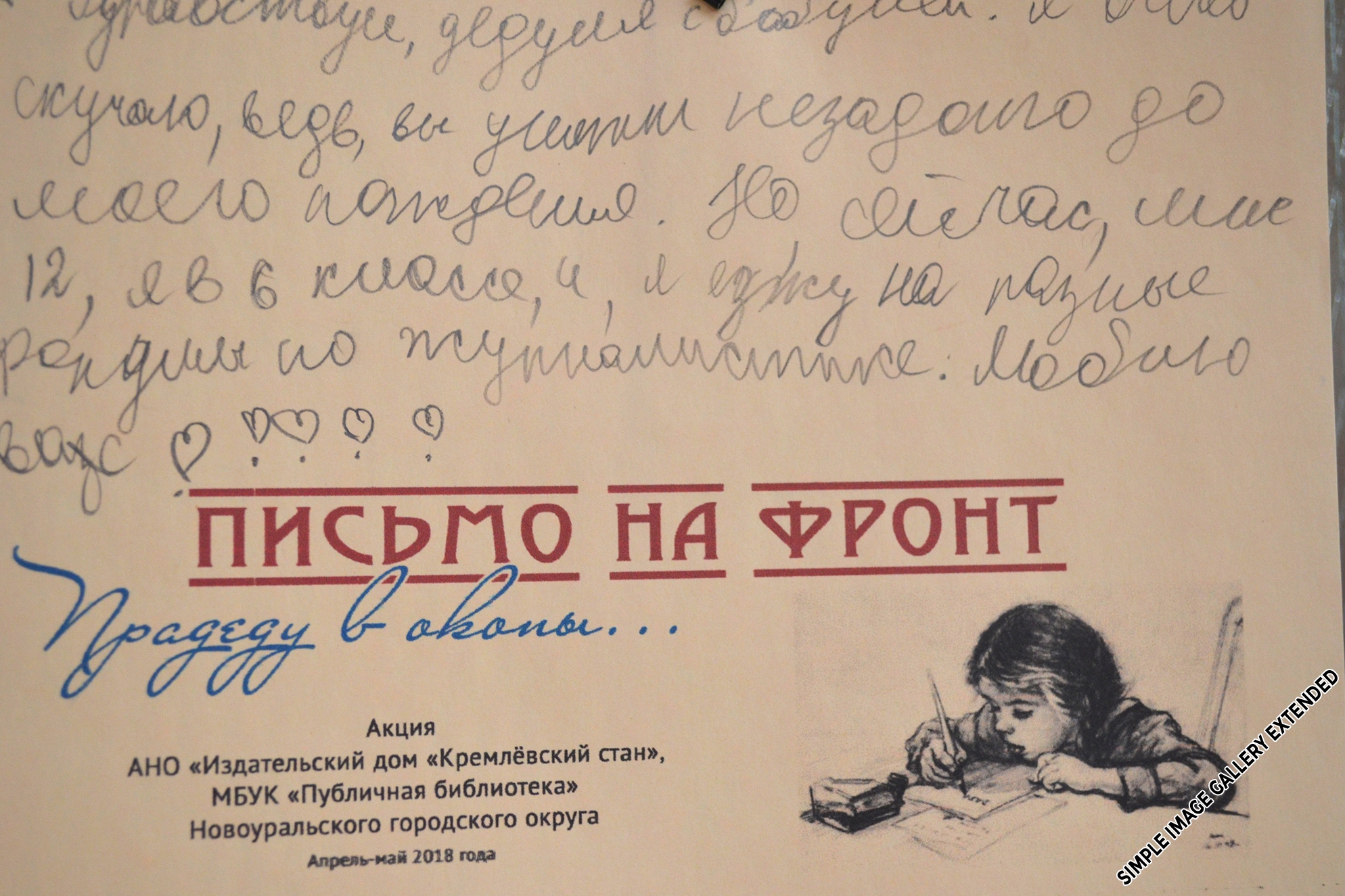 Дети и их родители писали на стилизованной под военные корреспонденции бумаге послания в прошлое: рассказывали о своей нынешней жизни павшим в боях прадедушкам, благодарили воинов Великой Отечественной за подаренное своим потомкам мирное время.