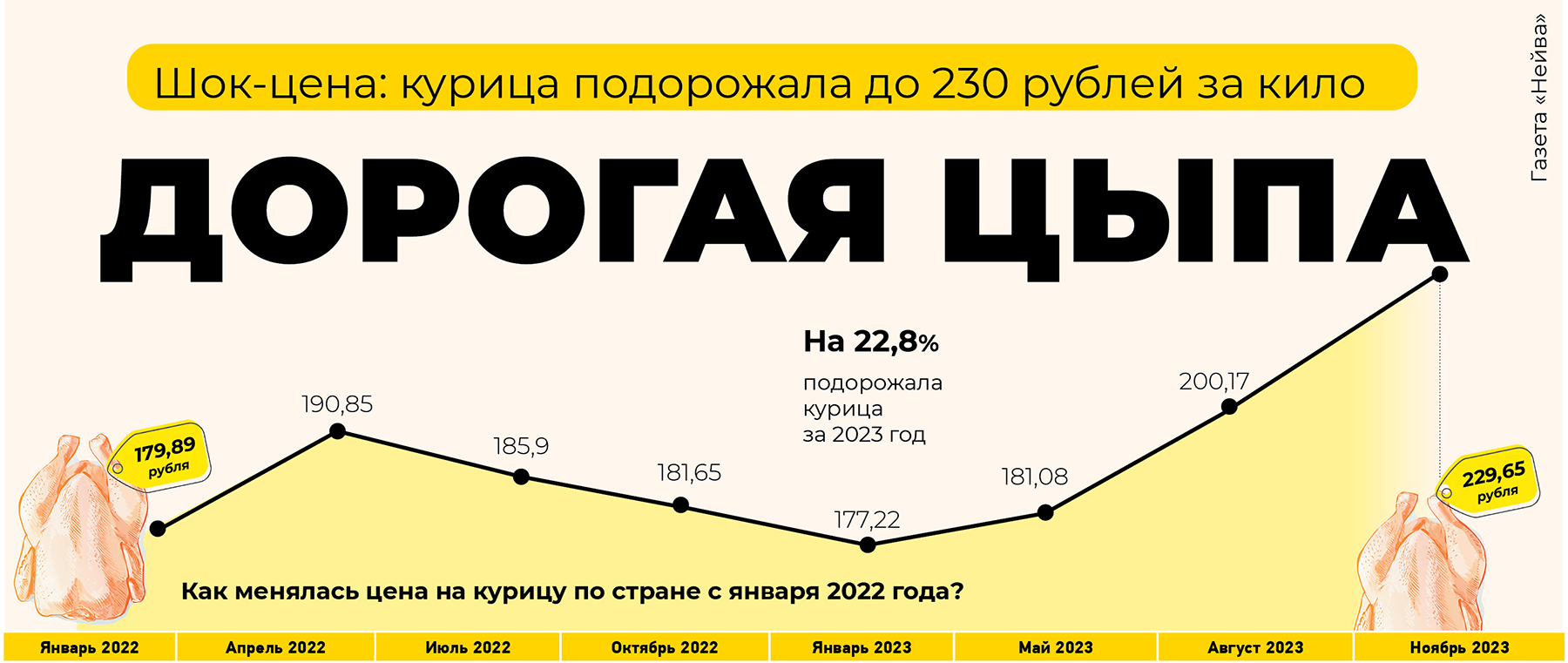 Минсельхоз объяснил это сезонными факторами. 16 октября на своём сайте Федеральная антимонопольная служба доложила, что птицеводы начали снижать оптовые цены на мясо кур. Между тем к ноябрю килограмм птицы в Свердловской области уже обходился в среднем в 226 рублей 12 копеек. В итоге за год курица поднялась в цене на 34%, сообщил Свердловскстат.