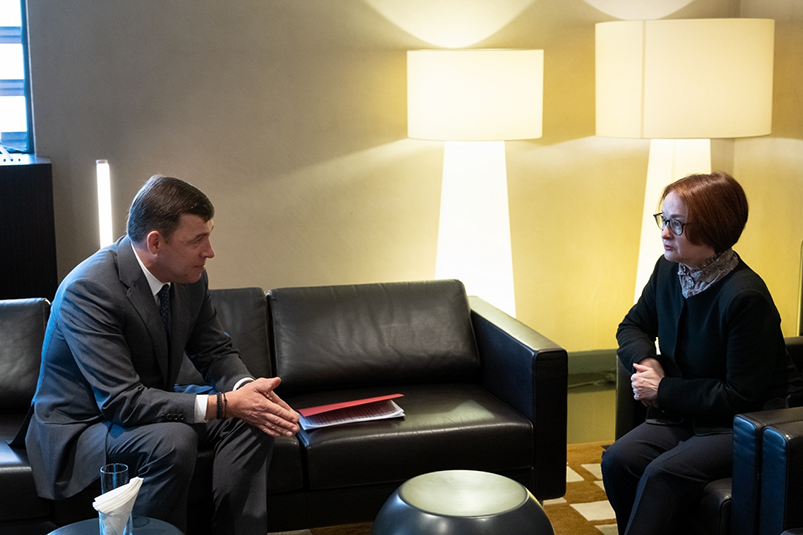 Губернатор также сообщил главе Центробанка об экономической ситуации в регионе в целом. По его словам, инвестиционная активность в Свердловской области сохраняется. Растёт доступность банковских услуг для жителей региона. Предпринимательское сообщество нацелено на решение вопросов в сфере импортозамещения, на создание новых высокотехнологичных производств. Особо Евгений Куйвашев отметил конструктивное сотрудничество, которое сложилось у областного правительства с Уральским главным управлением Банка России во главе с Рустэмом Мардановым.