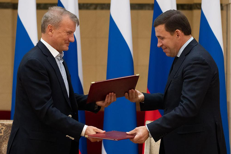 Губернатор Евгений Куйвашев и президент, председатель правления Сбербанка Герман Греф 6 сентября подписали соглашение о сотрудничестве между правительством Свердловской области и Сбербанком.