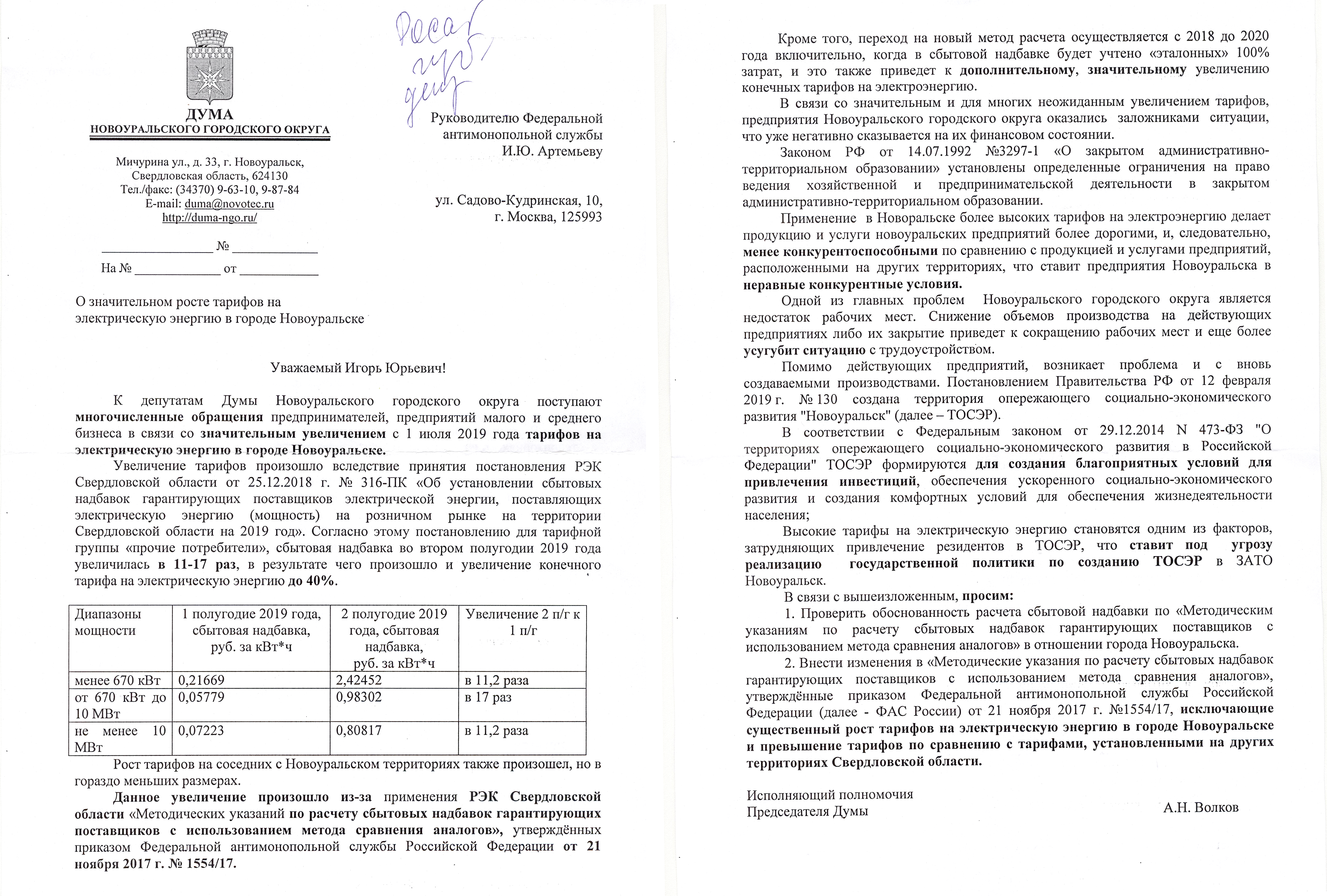 «Оплата потребленной электрической энергии — значительная статья затрат в бизнесе. Это повышение подрывает все экономические расчеты и планы, ведет к резкому повышению стоимости оказываемых услуг, уменьшению фонда оплаты труда работающих, что напрямую сказывается на финансовой стабильности предприятий города Новоуральска и росту безработицы!» — выдержка из письма.