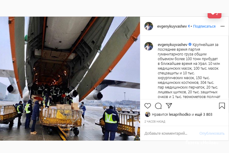 10 млн медицинских масок, 100 тыс. масок спецзащиты и 10 тысяч хирургических масок, 150 тысяч медицинских костюмов, 304 тысячи пар медицинских перчаток, 20 тысяч лицевых щитков, 20 тысяч защитных очков и 1 тысячу термометров получат свердловские и челябинские больницы. Об этом сообщил в своем Инстаграм губернатор Евгений Куйвашев.
