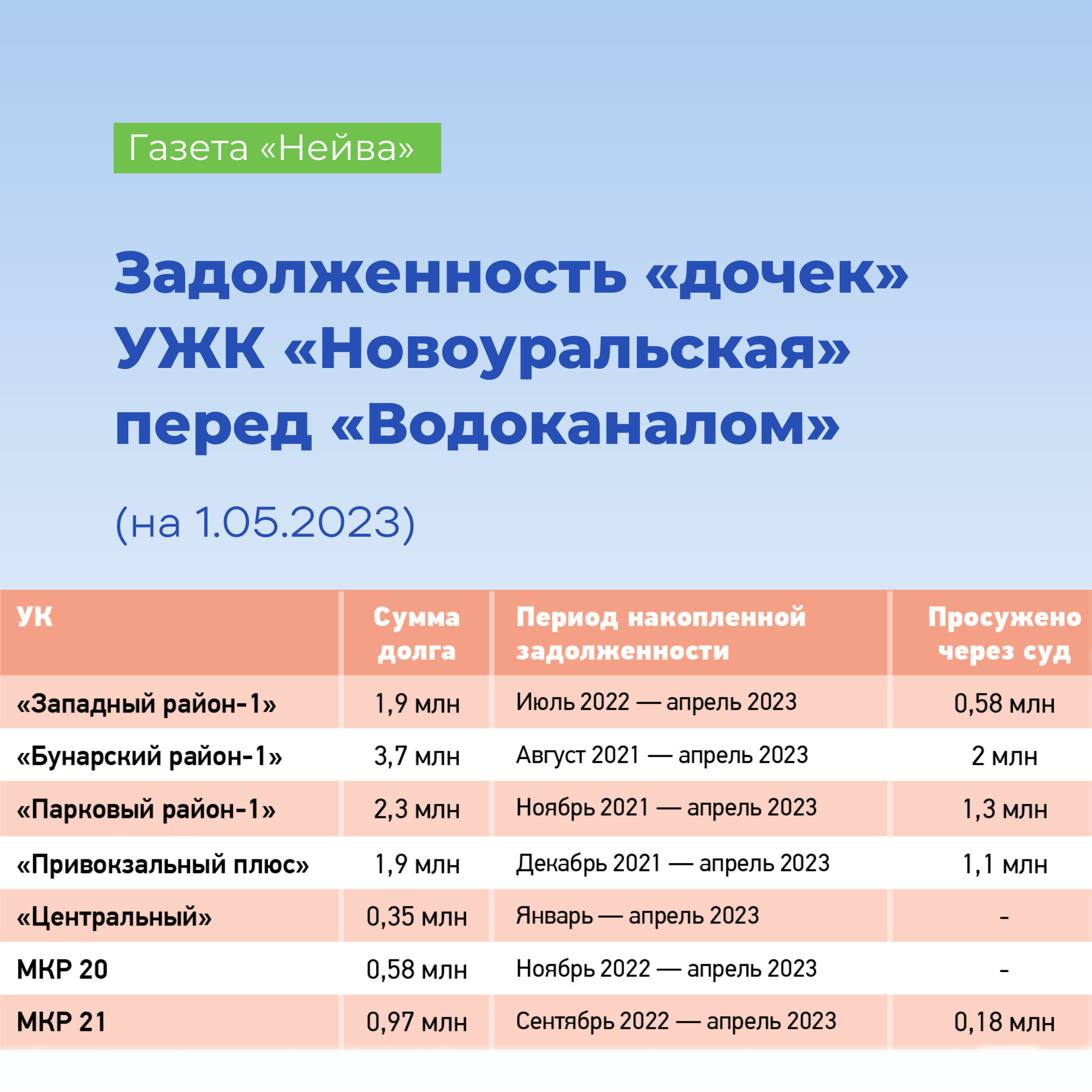 В числе «дочек», долги которых перед «Водоканалом» растут как снежный ком: «Западный район-1», «Бунарский район», «Парковый район», МКР 20 и другие (см. таблицу). По 5 млн уже есть решения судов, обязующих УЖК вернуть деньги. Добавим, что это только долги перед «Водоканалом», не считая других организаций: РИР, администрация НГО, ФНС и т.д.