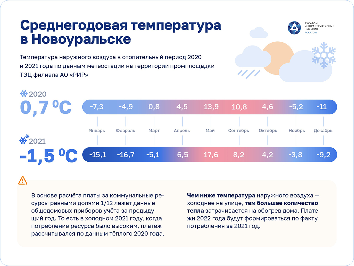 Уже точно можно сказать, что 2021 год был холоднее 2020 года. Средняя температура в отопительный период 2020 года — 0,7 градуса, в 2021-го — минус 1,5 градуса. Это значит, что тепловой энергии на отопление в 2021 году затрачено больше, чем в 2020-м, и жителям большинства домов придется доплатить за ресурс.