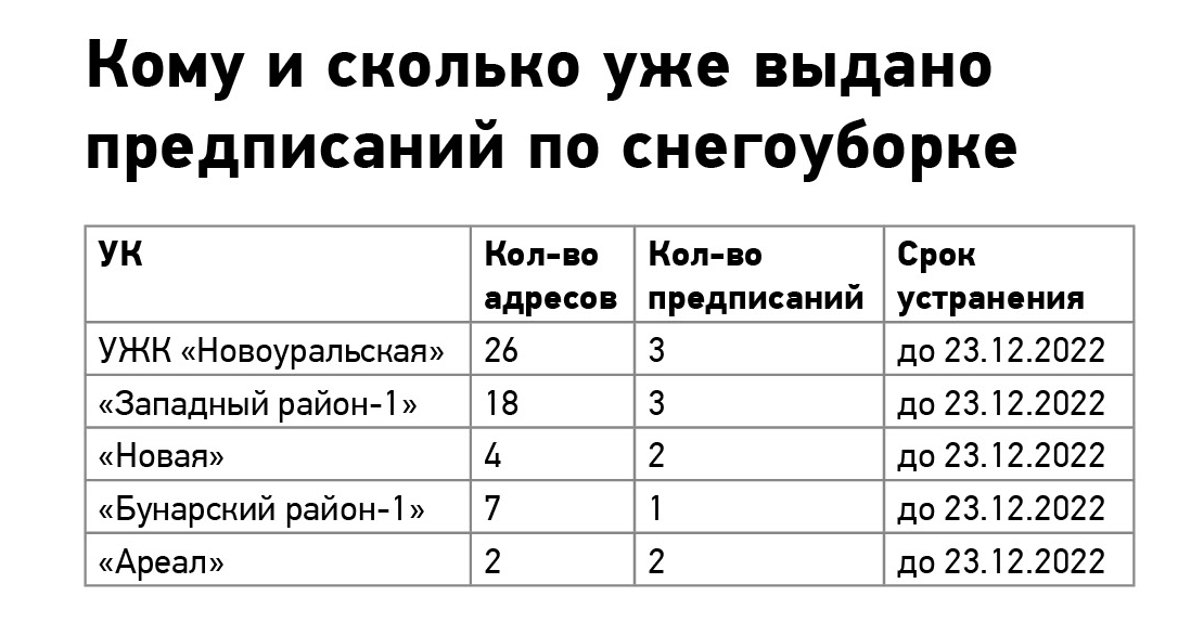 Добавим, что, по данным «Нейвы» на 9 декабря, административная комиссия администрации НГО выдала управляющим компаниям уже 11 предписаний по 57 адресам (!), согласно которым лидер плохой снегоуборки — УЖК «Новоуральская» (см. таблицу выше).