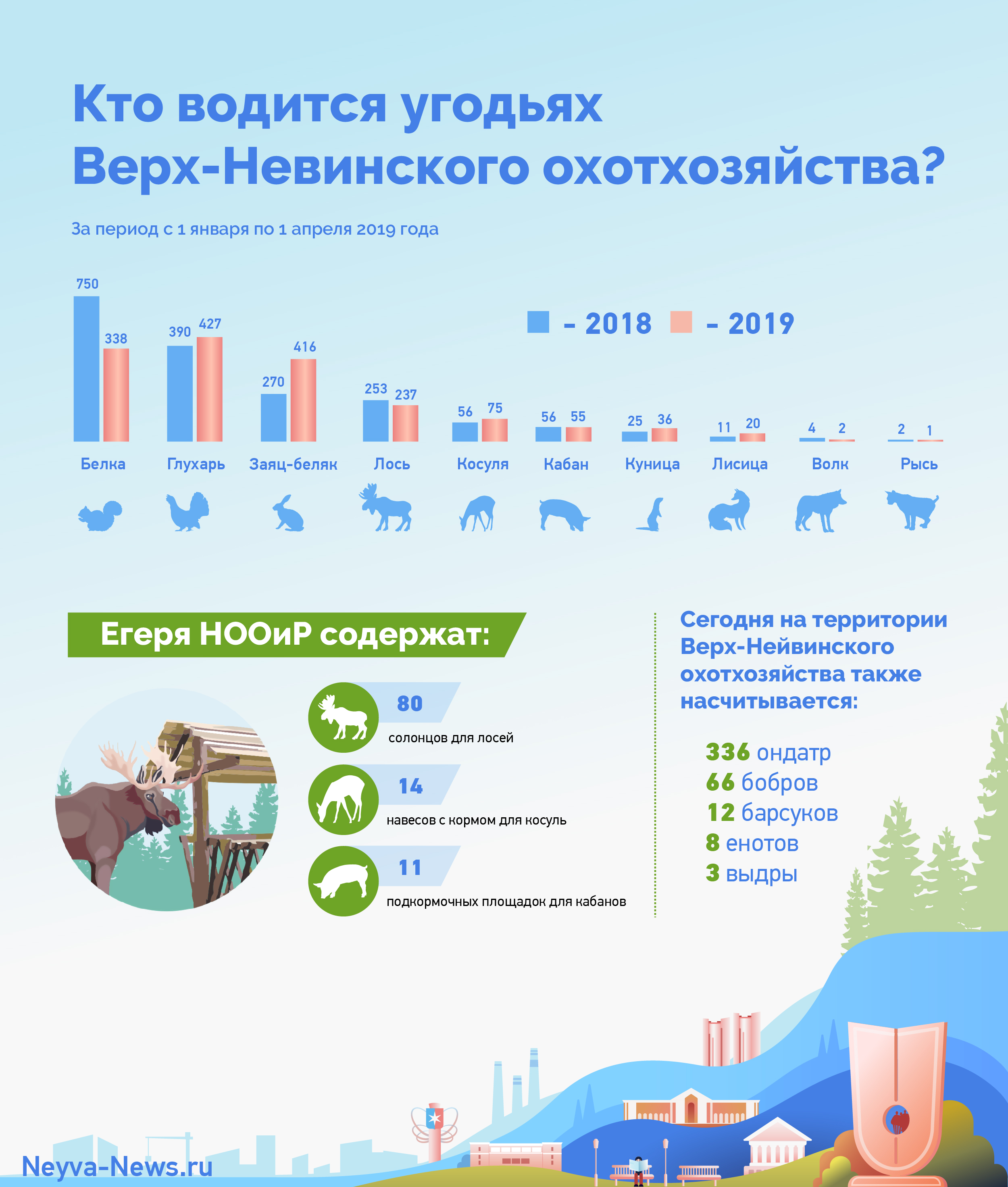 Рассмотреть это можно на примере Верх-Нейвинского охотхозяйства. Так, аналогично области в наших лесах выросла численность косули. Больше стало куницы и лисицы. Как и по области, снизилось количество белок и лосей. С другой стороны, если в области количество тетеревов увеличилось, то у нас уменьшилось. Но при этом больше стало глухарей и рябчиков. Кабанов – почти столько же, сколько и в прошлом сезоне.