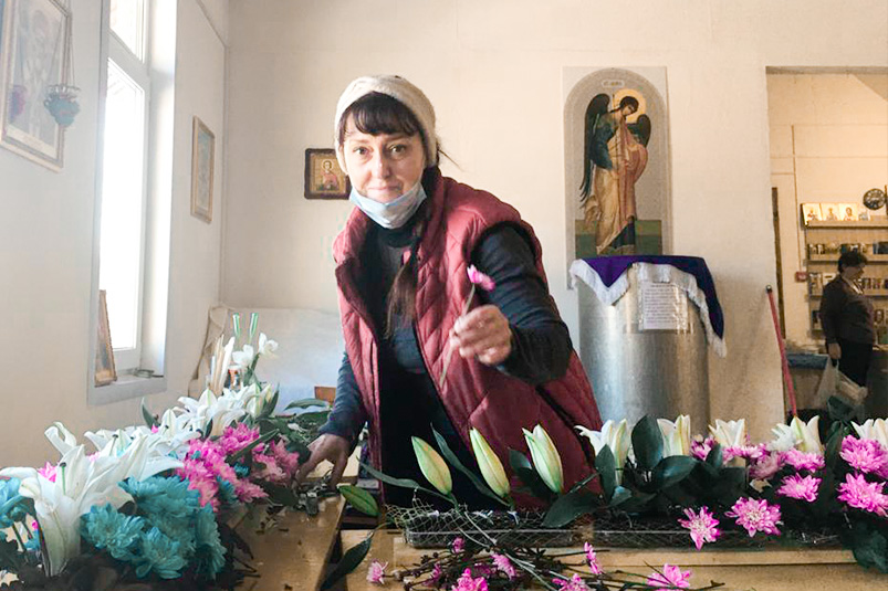 — Чтобы украсить храм к празднику, нужно не меньше двух световых дней, двух смен. Подготовить, обработать цветы, сделать заготовки для крепления, нужен определенный рисунок — эскиз, как должен выглядеть храм, чтобы было красиво, но не пестро… А что мне это дает, я не сформулирую красиво. Вот недавно с помощницей Татьяной и алтарником Александром Алексеевичем мы украшали наш Казанский храм к празднику Покрова Богородицы. Устали, конечно, спины мокрые, смотрю на людей в храме, а они какие-то другие, как будто в замедленном кино, а у меня на душе ангелы поют.