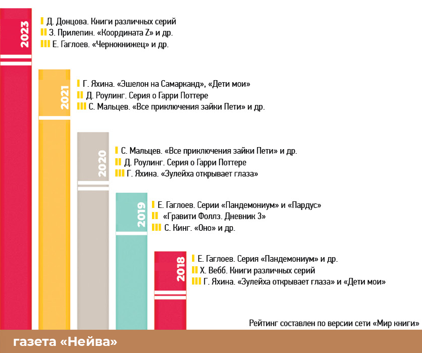 Напомним, что среди наиболее востребованных у новоуральцев в последние восемь-девять лет были книги таких писателей, как Гузель Яхина, Джоан Роулинг, Стивен Кинг, Евгений Гаглоев, Холли Вебб, Дарья Донцова. При этом есть топ-3 наиболее популярных авторов. И новоуральский писатель Евгений Гаглоев почти постоянно в нём, лишь редкий год уходя в топ-5. В 2023-м он вновь вернулся в «тройку» с серией «Чернокнижец». Пятёрка же лидеров по итогам прошлого года выглядит так: Дарья Донцова, Захар Прилепин, Евгений Гаглоев, Михаил Лабковский, Екатерина Вильмонт.