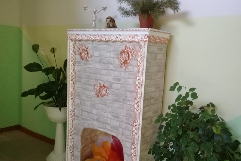 Перво-наперво подъезд к празднику украсили. Поставили фигуры Деда Мороза и Снегурочки, на каждом этаже — по елочке, развесили гирлянды, мишуру, новогодние игрушки. На окнах — занавески. Соорудили камин: его вырезали и склеили из картона, расписали красками. Внутрь положили несколько полешек. Иллюзию живого огня создали из цветной бумаги. Снизу подсветили специальной лампой.