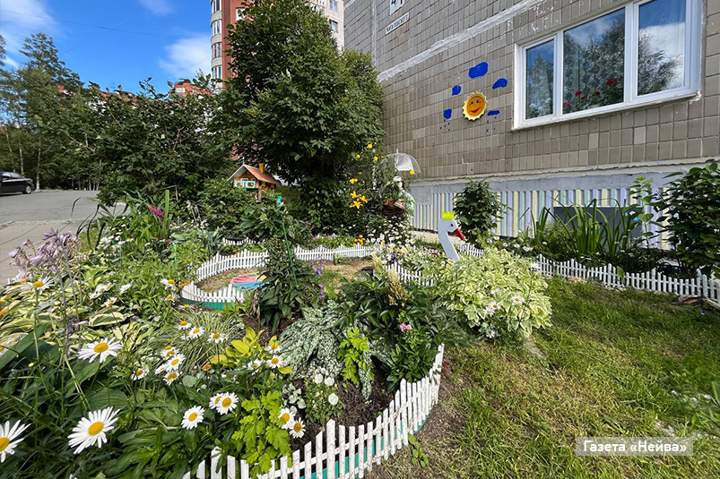 Летом у подъезда собираются от мала до велика, даже из соседних домов приходят отдыхать. Тут цветут гортензии, розы, лилии; растет калина, сирень и дубочки. Кстати, во дворе можно не только любоваться цветами. Для малышей оборудована детская площадка с горками и качелями. Для любителей здорового образа жизни — новенькие тренажеры. И все так компактно и уютно. Оказывается, можно при желании! «Восьмой десяток пошел, а все некогда. Вот и сейчас надо выходить и траву полоть!», — говорит Татьяна Алексеевна.