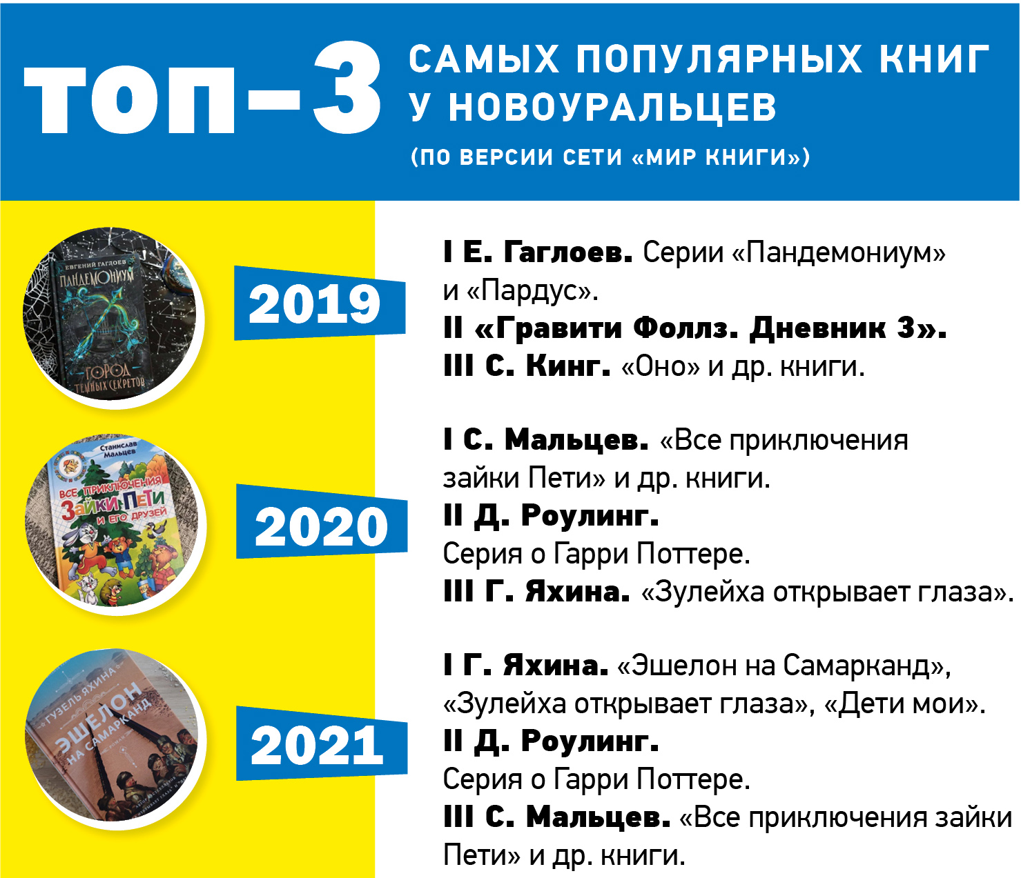 Более десяти лет в содружестве с сетью магазинов «Мир книги» мы составляем рейтинг популярности у новоуральцев книг и авторов. Оценку делаем на основе уровня продаж в течение года. Традиционно подготовили рейтинг и по итогам 2021 года. И должны сказать, что 2021-й существенно отличается от 2020-го.