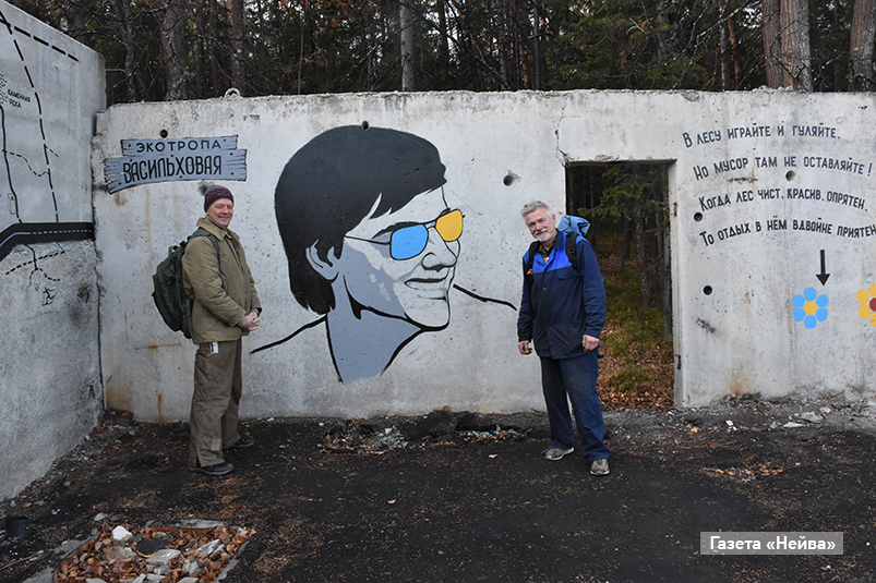 Жёлтые цветочки на стволах лиственниц и сосен заманчиво влекут шагающих по лыжной трассе горожан и приводят к бетонным вратам, оставшимся от заброшенных гаражей. На них — счастливый мужской портрет, маршрутная карта и напутствие для туристов: «В лесу гуляйте и играйте, но мусор там не оставляйте!».