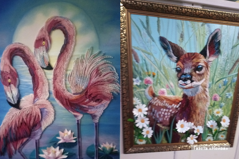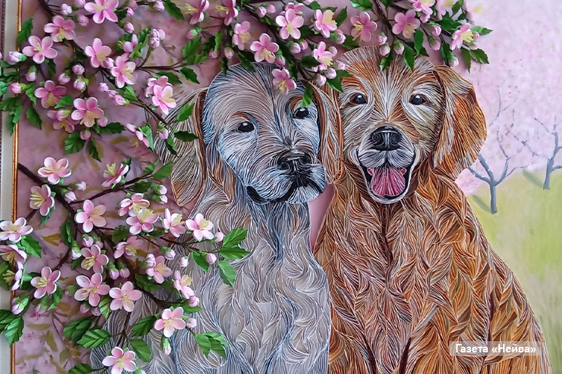 А вот другая серия картин — с изображением животных «Тигр», «Олененок», «Розовые фламинго», «Золотые ретриверы» — выполнена в оригинальной технике, с эффектом объема. Это Ольга Плещева придумала сочетать квиллинг с масляной живописью! Основа картины пишется маслом, а фигуры животных и птиц накладываются в технике квиллинга. Причем прежде бумага дважды обрабатывается акриловым лаком и только потом скручивается. Бумажные модули складываются очень плотно друг к другу и смотрятся как ворсинки шкуры животного. И в целом звери и птицы выглядят как живые. Это настоящее мастерство!