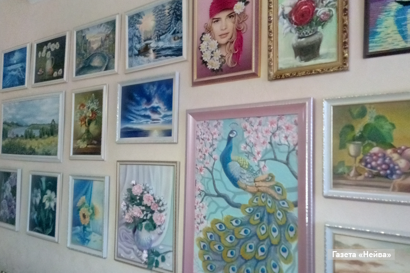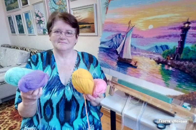 …Ее квартира напоминает картинную галерею: все стены — в рукотворных полотнах, выполненных в самых разных техниках. В углу комнаты на подрамнике — очередная работа: еще пара дней, и из-под руки мастерицы выйдет живописный уголок природы — нетканый гобелен, теплый и мягкий, кропотливо собранный из разноцветных ниточек пряжи.