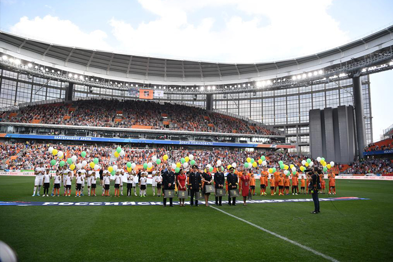 Перед началом матча болельщики горячо поприветствовали экипаж лайнера «Уральских авиалиний», и сам Дамир Юсупов под аплодисменты зрителей ввел мяч в игру.