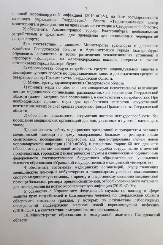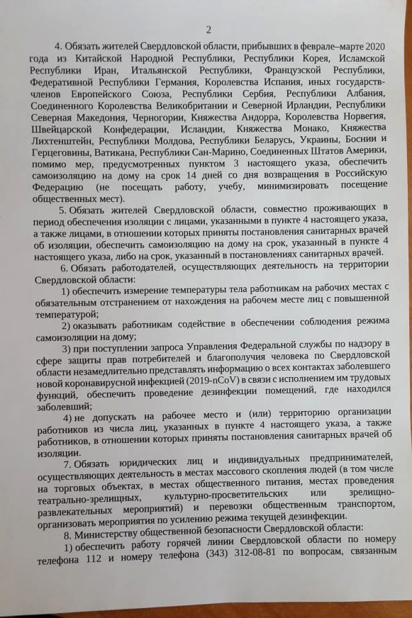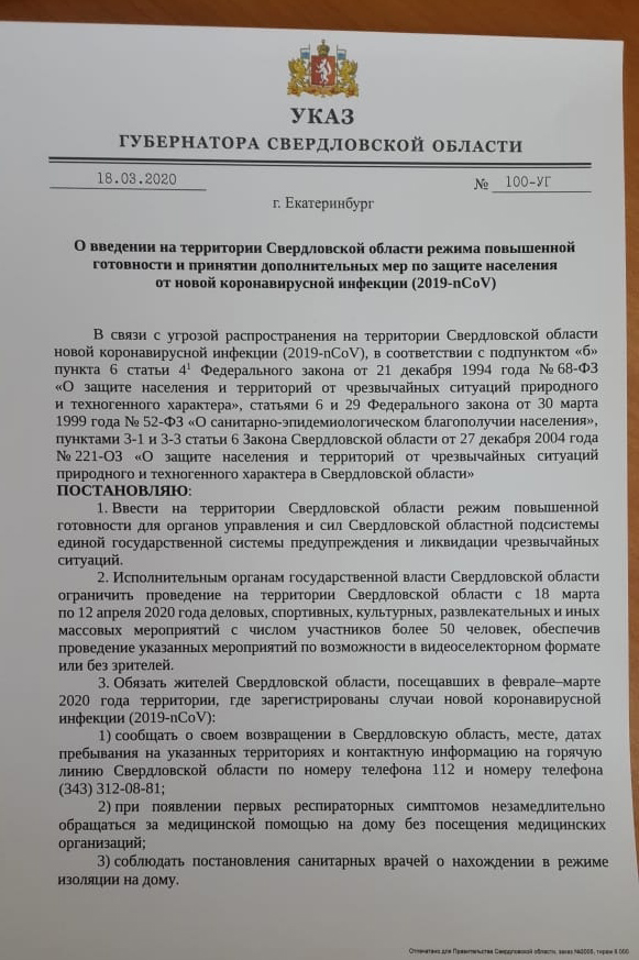 Сегодня же, 18 марта, губернатор издал указ «О введении в Свердловской области режима повышенной готовности и принятии дополнительных мер по защите населения от новой коронавирусной инфекции (2019-nСoV)».