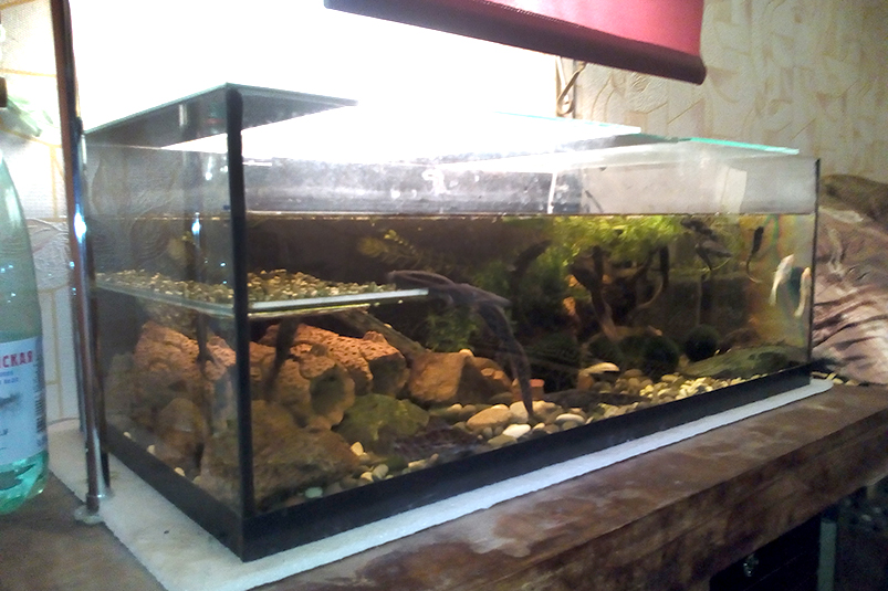 Как иначе объяснить, что в своей однокомнатной квартире, на 38-ми квадратных метрах, они разместили 8 (!) аквариумов с рыбками и испанскими иглистыми тритонами, приютили двух морских свинок и трёх кошек!