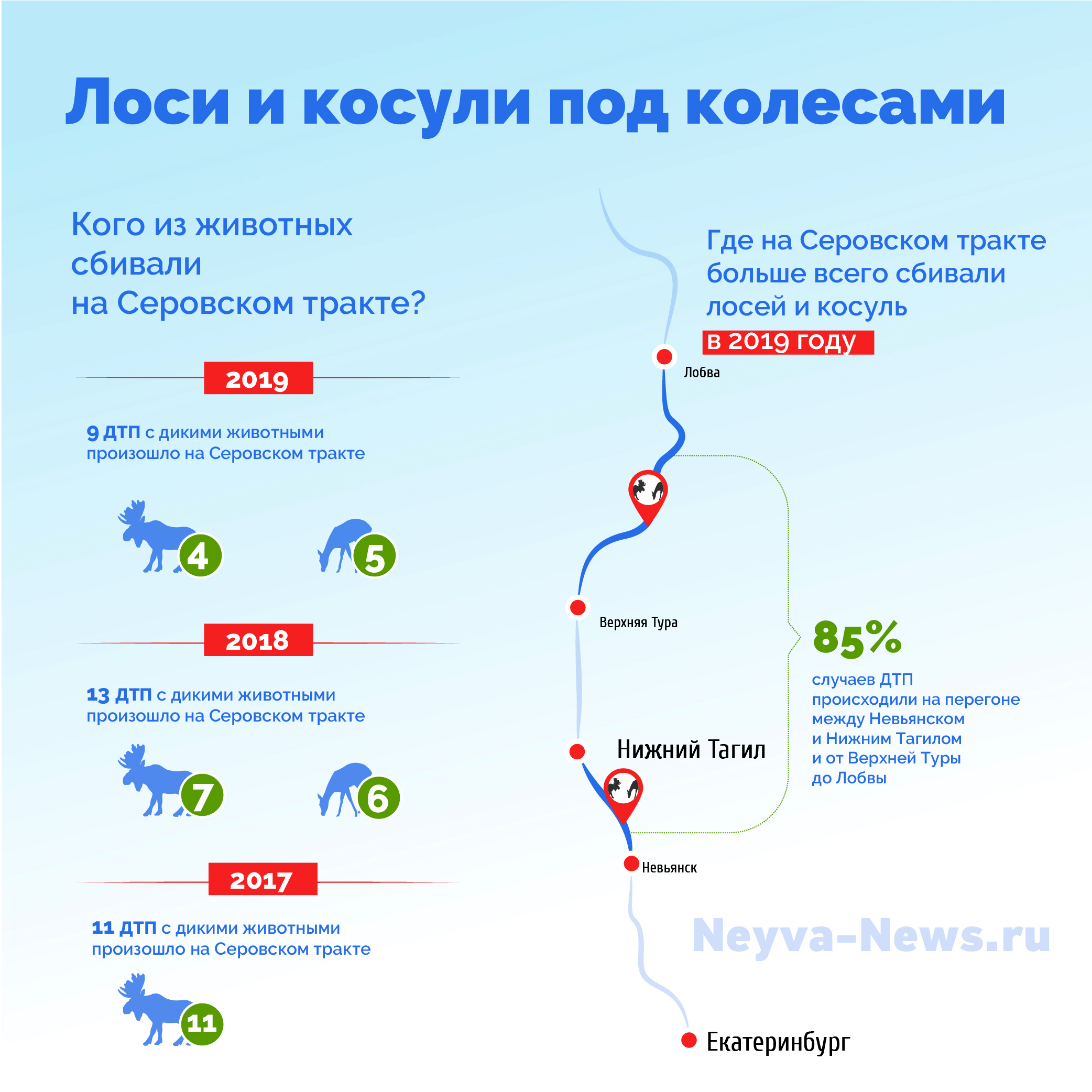 13 ДТП с дикими животными произошло на Серовском тракте в 2018 году. Из них восемь на перегоне между Невьянском и Екатеринбургом, три — между Невьянском и Нижним Тагилом. В ДТП попали семь лосей и шесть косуль. Лишь в одном случае животное вскочило и умчалось в лес, в остальных — погибали на месте.