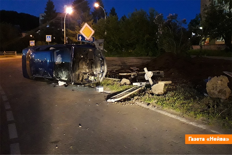 В эту же ночь на круговом движении у стелы перевернулся БМВ (на фото). Как указано в документах, он столкнулся с ограждением и в итоге оказался на обочине на правом боку. Прибывшие на место сотрудники МЧС при помощи аварийно-спасательного инструмента вскрыли искорёженный капот и обесточили машину.