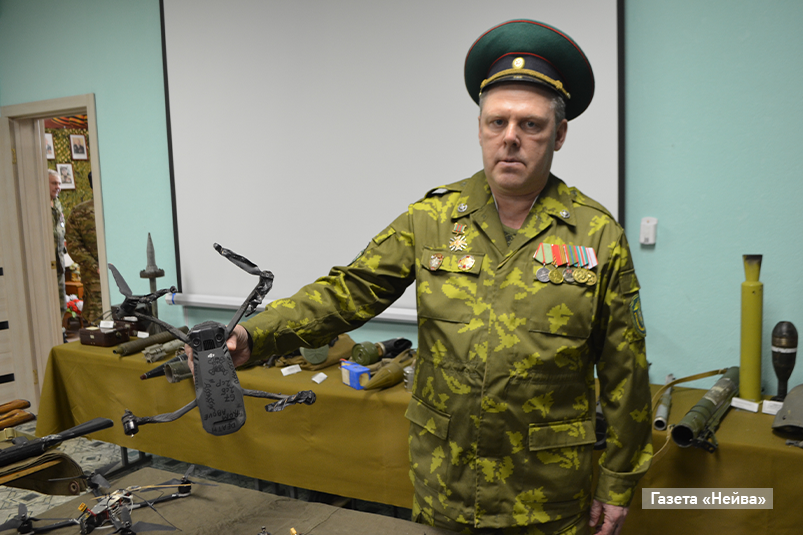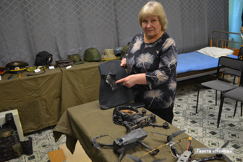 В ходе встреч школьникам рассказывают не только об участниках-земляках Великой Отечественной, ребятах, прошедших горячие точки, но и о героях СВО. И конечно, знакомят с новыми экспонатами. Среди них — вражеский дрон, сбитый Дмитрием Тильниковым; бронежилеты Олега Макеева: один — с нашивкой «Мама сказала надеть» и саперным инструментом, другой — пробитый пулей .
