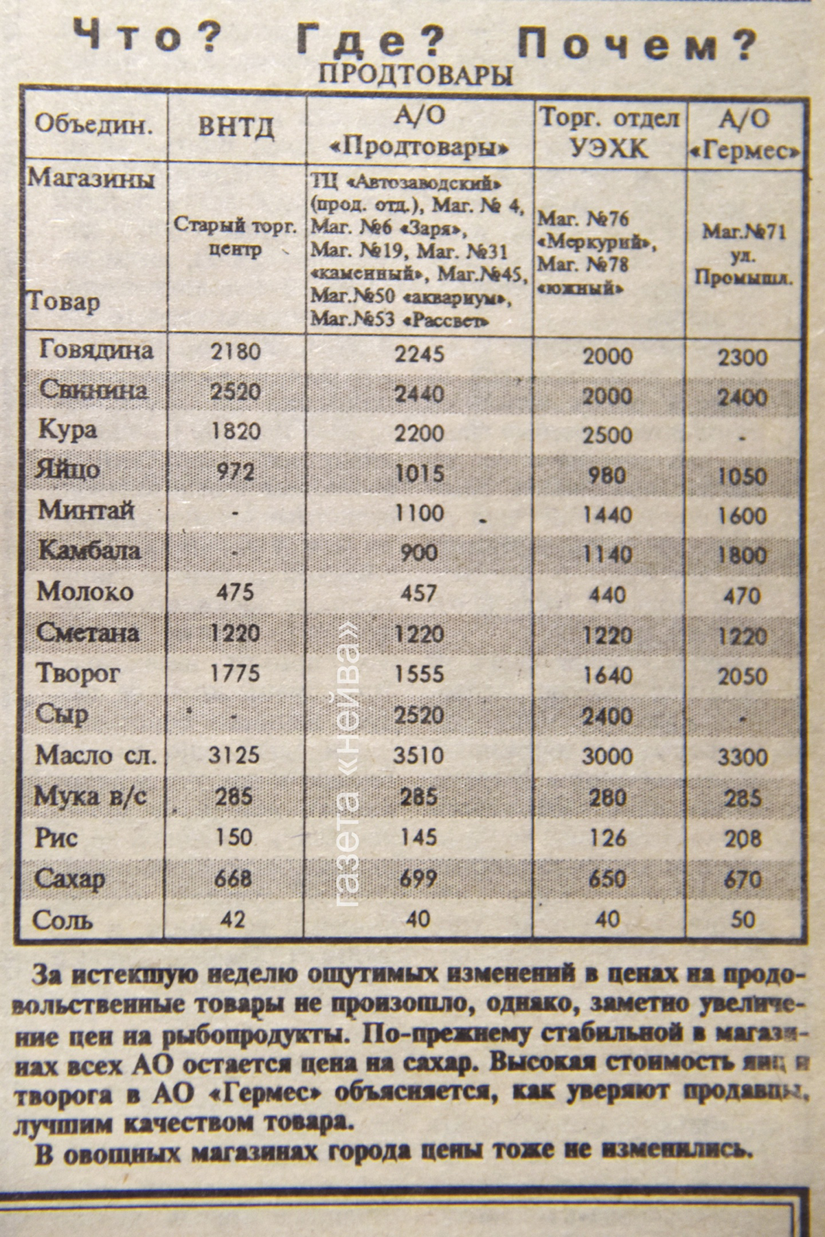 За 1993 год в расчёте на каждого жителя города было продано продтоваров на 267 тысяч рублей, непродовольственных — на 277 тысяч. Во втором полугодии 1993 года из расчёта на каждого жителя было приобретено 17,6 кг мяса и птицы, 8 кг колбасы, 12,6 кг рыбы, 5 кг масла, 30 кг сахара, 24 литра алкоголя (включая пиво).